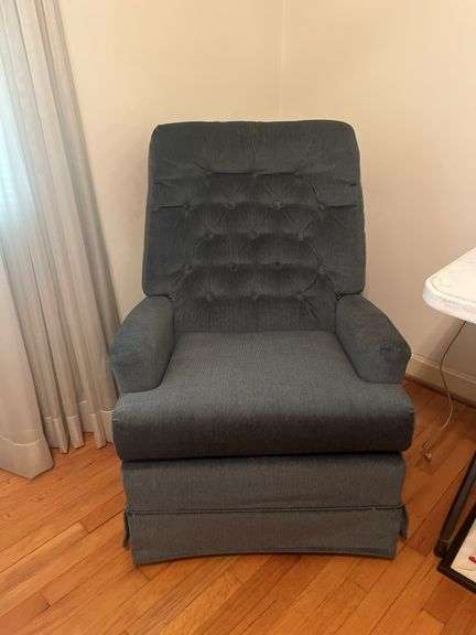 Blue chair swivels and rocks and measures 35" tall x 27" wide x 27" deep.