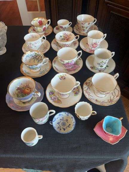 (12) miscellaneous cups and saucers and (5) tiny saucers. Perfect for a collector or a little tea party.