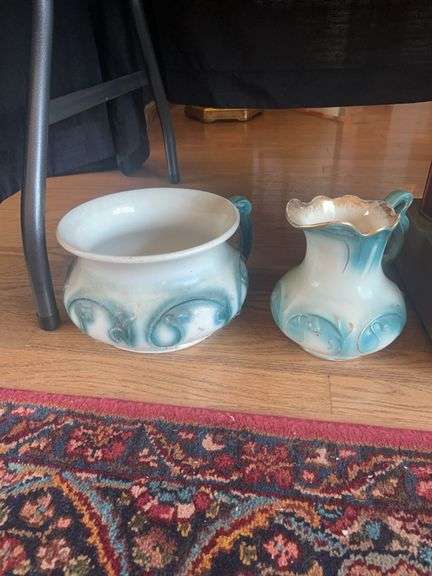 Turquoise and gold small pitcher and chamber pot.