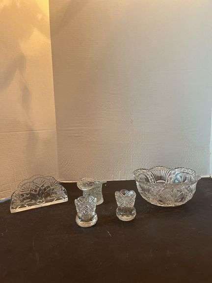 Crystal bowl, top hat tooth pick holder, napkin holder, and two tooth pick holders