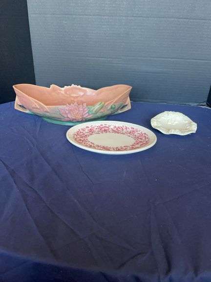 (1) vintage Roseville Pottery Water Lily Console Bowl. (1) oval plate that appears to have been pieced back together and a small white dish could be used for a soap dish or a ring dish.