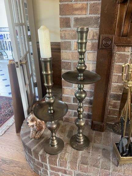 (2) vintage models Moroccan etched brass pillar floor altar candlestick candle holders. One is 36” tall and one is 31 1/2” tall.
