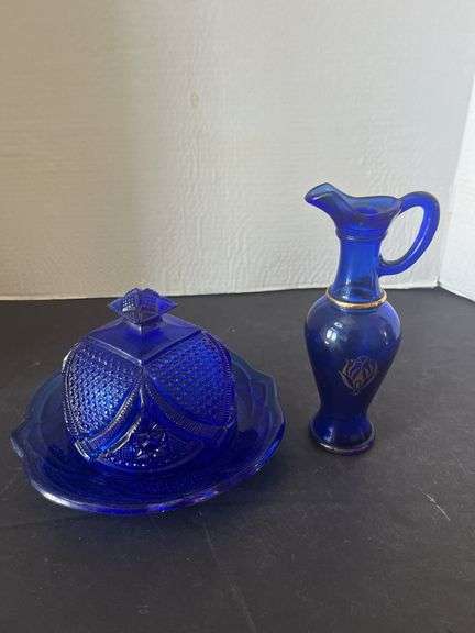Vintage cobalt blue covered butter dish and small blue pitcher with gold accents