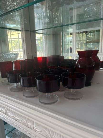 Set of eight ruby red glass dessert dishes, a vase, and 5 glasses