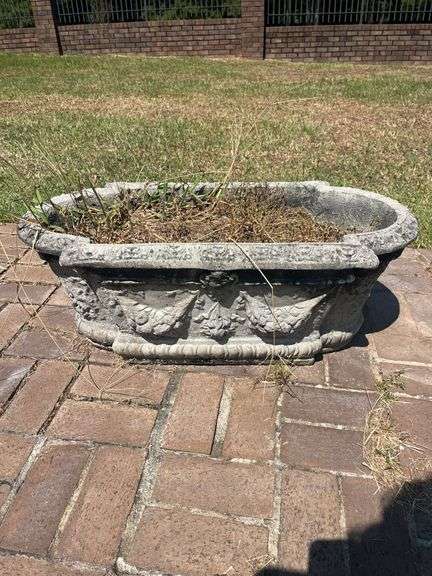Pair of oval cement planters measures 12" tall x 31" x 16".