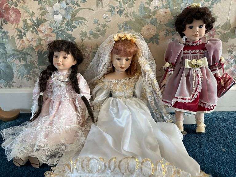 Three vintage dolls as shown; one with red dress is marked Dynasty Doll Collection; other two dolls not marked