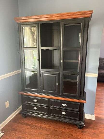 Black cabinet with 2 glass doors and one solid door above and 4 small drawers for storage below. The center section has a slide in for wine glasses. This piece measures 46" wide x 16" deep x 76" tall.