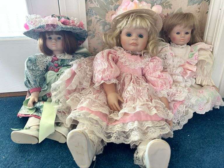 Four dolls as shown; doll in blue dress is marked as Brinn’s porcelain doll and has number; German doll in white dress marked “Engel Puppe” translates to Angel Doll; doll in lavender dress marked Seymour Mann named Violet; International doll in striped dress not marked