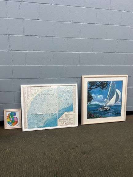 One framed Murrell's Inlet map is 39" x 26, one small shell coloring, and one large sailboat print.