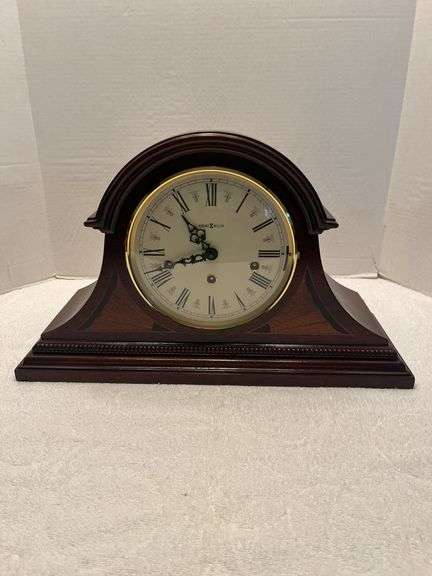 Howard Miller mantel clock. Features a wood case with a round face and Roman numerals. Model number 613-192. No key but runs when wound. 18" wide x 11" tall