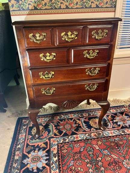 DescriptionThis is a charming American Drew silverware chest. The chest features five drawers with brass hardware and cabriole legs. This silverware chest is perfect for storing and organizing your silverware. It measures 25" wide x 16.5" deep x 36" tall. Contents in pictures are NOT included - chest only.