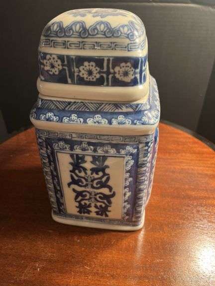 This is a beautiful blue and white porcelain jar. It features a geometric and floral pattern on the lid and body of the piece. It is 10" tall.