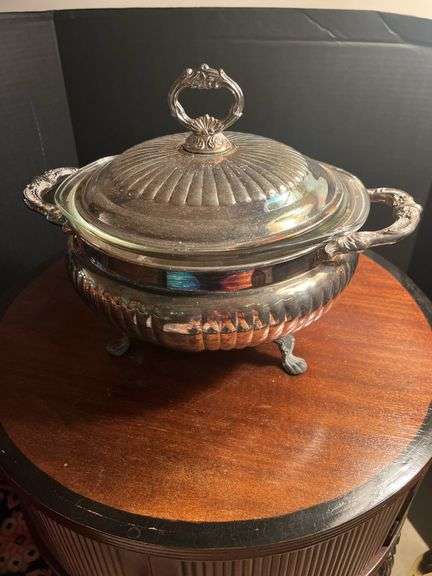 DescriptionThis is a silver plated serving dish, it has a glass insert and a matching lid. It features ornate handles and a detailed base with small feet. The glass insert is ribbed. This elegant piece would make a beautiful addition to any table setting.