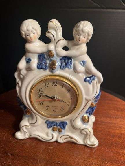 Porcelain table clock with a cherub design. The clock needs batteries so untested. It measures 9" tall.