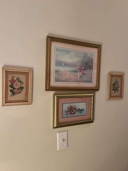 Collection of four framed art prints. Includes two floral still life prints signed 'Chirat', one landscape print signed 'Nora Debott', and one bouquet print signed 'Glynda Turley'. All are framed and ready to hang.