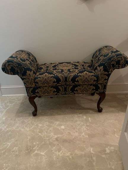 This is an upholstered bench with dark floral fabric and carved cabriole legs. It has winged sides. It is 41" long x 26' tall.