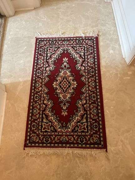 This is a 2' x 4' red accent rug with a detailed pattern and fringed edges.