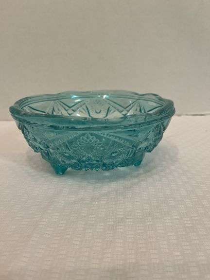 Decorative blue glass bowl featuring a geometric pattern and small feet measuring 7" x 3"