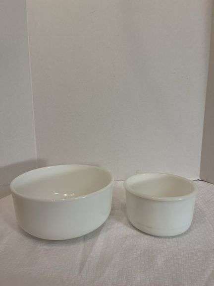 This listing features a set of two white ceramic bowls. The bowls are different sizes, as shown in the photos. Perfect for various kitchen and dining needs.