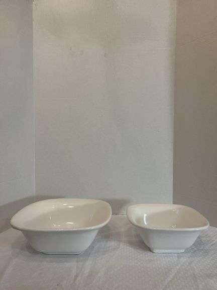 This auction features a set of two white ceramic bowls. They have a modern square design with rounded corners. The underside is marked 'Made in Italy'.