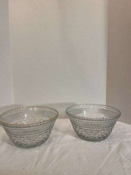 This auction features two vintage clear glass bowls. Both bowls have a detailed diamond pattern throughout. these measure 9.5" in diameter x 5" tall.