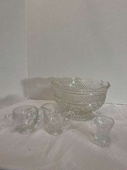 Vintage clear glass bowl with a pedestal base, a matching creamer and sugar bowl featuring a leaf design, and a small decorative vase.