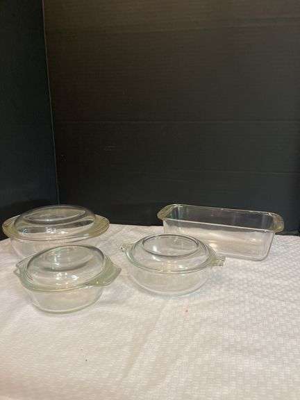 This lot includes a variety of clear glass baking dishes, including round casserole dishes with matching lids and a loaf pan. Perfect for baking and serving your favorite dishes.