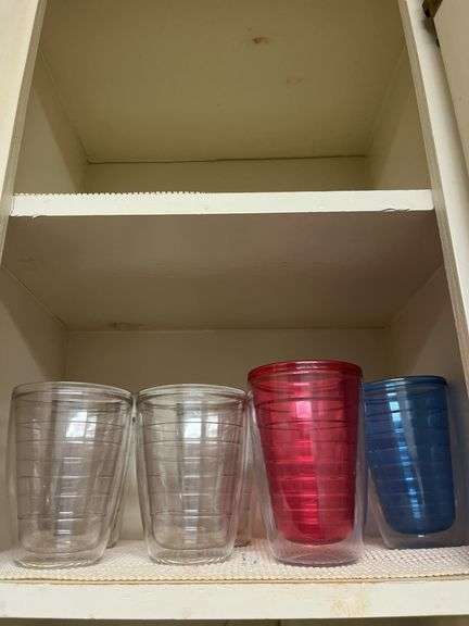 This lot features six drinking cups. There are 4 clear, 1 red, and 1 blue. They are double walled.