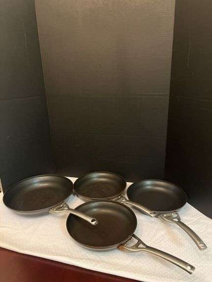 This listing is for a set of four Calphalon nonstick fry pans. All the pans have the Calphalon brand marked on the handles.