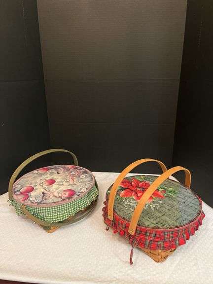 DescriptionThis set features two decorative baskets with lids, each showcasing unique designs. One basket features a design with apples and birds, while the other has a poinsettia and music sheet design. Both baskets have coordinating fabric linings and trims.