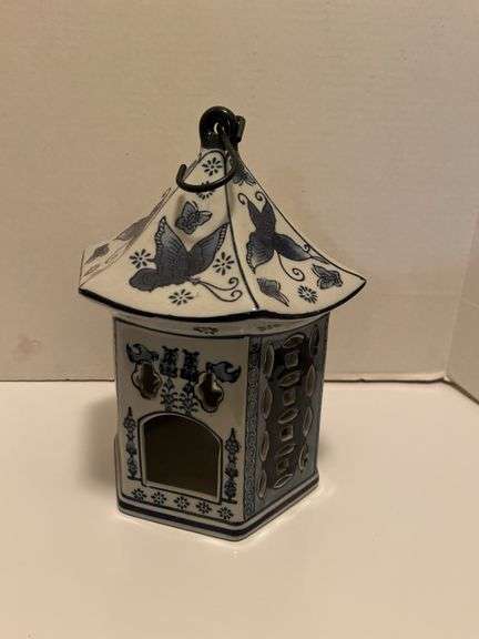 Ceramic pagoda style candle holder with open sides for candlelight and butterfly and flower accents. The pagoda style top has a loop handle.