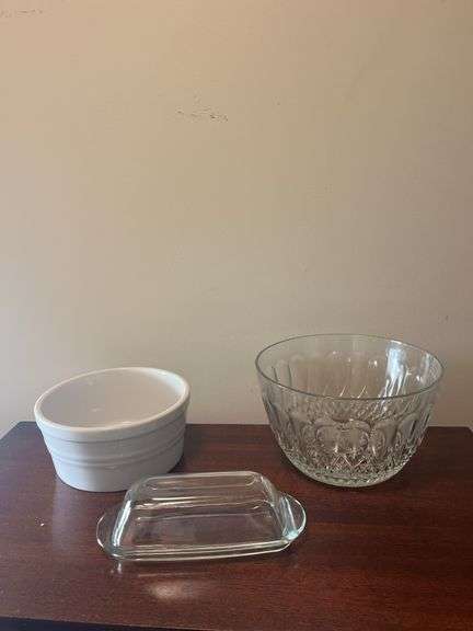 This lot includes three items: a white ceramic bowl, a clear glass butter dish with a lid, and a large clear glass serving bowl with a decorative pattern.