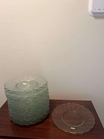 A collection of 24 clear glass plates. Each plate features a decorative scalloped edge.