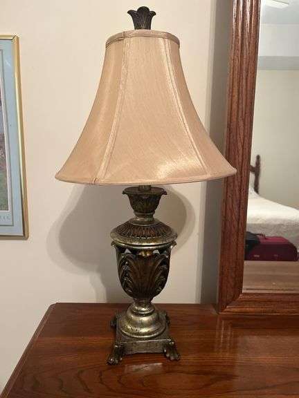 This auction features a 26" table lamp with an ornate bronze finish. The lamp has a leaf-patterned design on the base and a neutral-colored lampshade. It is a stylish lighting accent for any room.