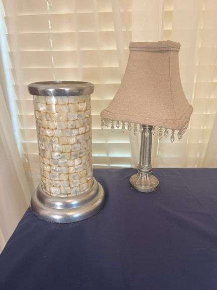 Two accent lamps will add a touch of elegance to your home. One 10" lamp features a tan fabric shade with crystal bead embellishments. The other is 12" and has shell mosaic cylinder shade.