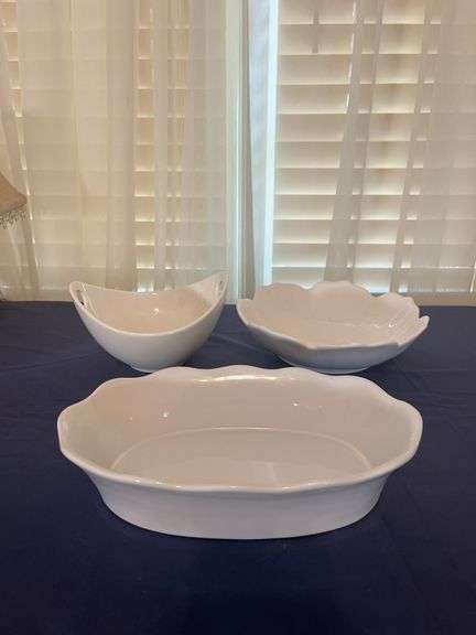 Set of three white ceramic serving dishes. Includes a bowl with handles, a round scalloped dish, and an oval scalloped dish.