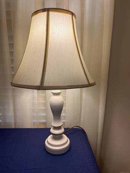 This is a stylish table lamp featuring a white base and a complementing fabric shade. This lamp is 24" tall.