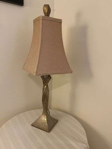 This listing is for a 28" table lamp. It features a tan-colored, square shade and a decorative gold base.