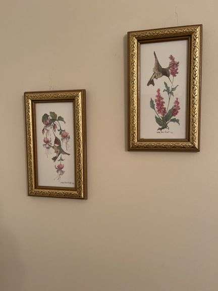 You are bidding on a set of two framed prints by Carolyn Shores Wright. The prints feature hummingbird illustrations and are framed in decorative gold frames.