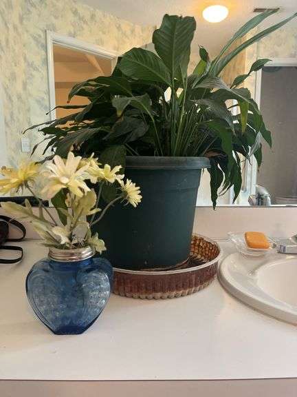 This lot features a live healthy Peace Lily plant in a large green pot, along with a separate decorative flower arrangement in a small blue vase. Perfect for adding a touch of nature and charm to any room.