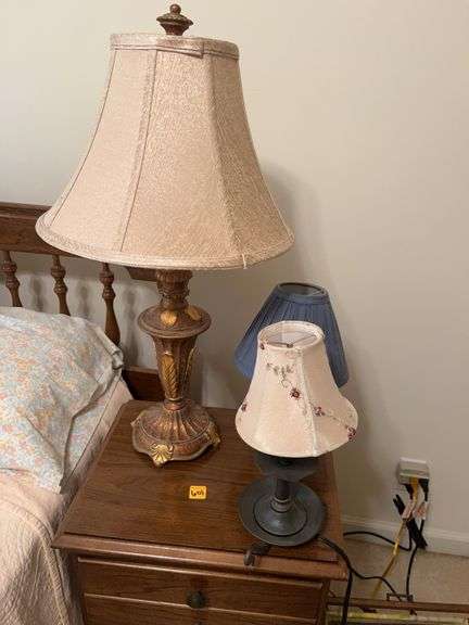 DescriptionThis auction features a set of three unique lamps. The set includes a large lamp with a patterned tan shade and ornate base, a smaller candlestick style lamp with a floral shade, and a ceramic base lamp with a blue pleated shade and floral detailing. All lamps appear to be in working order.