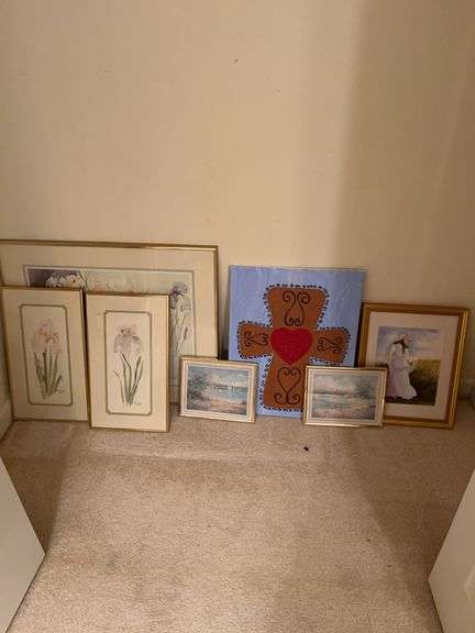 This lot includes a collection of framed art prints. Subjects include floral pieces signed by Genie M. Tawery, a woman in a field, boats on the water, a cross, and lake scenes. Frames are gold colored metal and wood.