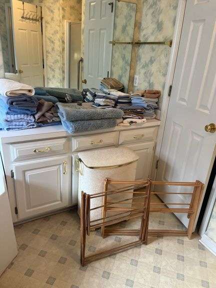 Includes a lidded laundry hamper with handles, a collection of bath towels, padded hangers, and two foldable drying racks.