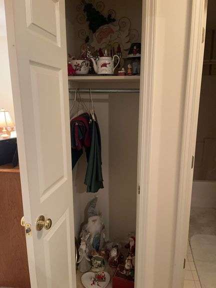 The contents of this closet include a collection of Santa Claus themed decorations and holiday decor. Includes Santa figurines, a teapot, Christmas themed table cloths and other decorative items.