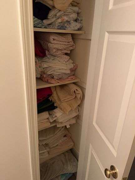 Contents of closet include miscellaneous household linens. Includes blankets, sheets, towels, and more, in various colors and patterns.