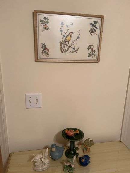 DescriptionThis lot features a framed print showcasing various bird species in a nature-inspired setting. Also included is a collection of bird figurines made of ceramic and other materials. The framed print shows multiple bird species, including a meadowlark as the central figure.
