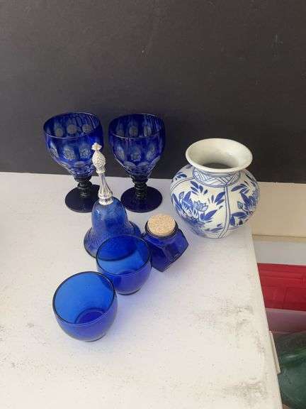 Collection of assorted blue glassware including drinking glasses, small bowls, a bell, and a small bottle with cork stopper, as well as a ceramic vase.