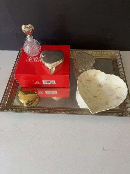 This lot includes a variety of heart-shaped trinket boxes in gold, silver, glass, and floral patterns. Also included is a glass perfume bottle with a heart-shaped stopper and a delicate floral bowl.