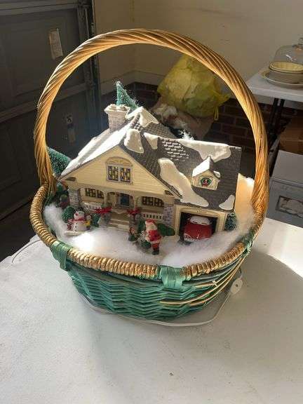 A charming holiday decoration featuring a miniature house nestled in a basket, decorated with snow, trees, and figures including Santa and a snowman. The house has a light-up feature and a car parked in the garage. Not tested.