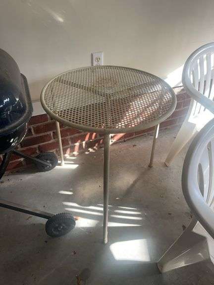 This is a round metal outdoor patio table with three legs. It has a perforated top. Perfect for your garden or patio.